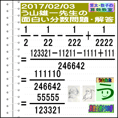 (2017/02/01(水)は、【11/22222 - 1/2222 = 555/12344321】です)
