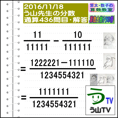 (今月1週目、2016/11/04(金)は[11111/123321=11111/(111×1111)]です)