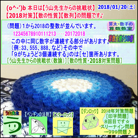 2018/01/20(土)[印字問題・数の性質・数列]9がちょうど3個連続