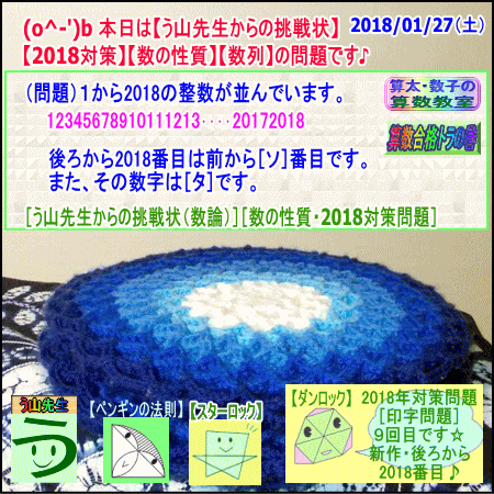 2018/01/27(土)[印字問題・数の性質・数列]後ろから2018番目は前から何番目、その数字