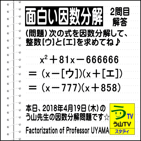 2018/04/19(木)[x^2+81x-666666 = (x-777)(x+858)]←本日(o^-')b