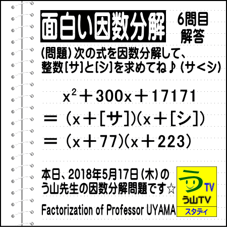 2018/05/17(木)[x^2+300x+17171=(x+77)(x+223)]←本日(o^-')b