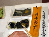 一日遅れの報告になりますが、昨日行われたフォーラムと加工コンクールについて・・・・毎年恒例になったこの行事。食に関して町内で活動している団体や個人のお話や(今回は小学校の先生や教育委員会の方、酪農女性部、私も少しお手伝いさせていただいた宅配便を始めた方のお話でした)町外で活動されている方々(今回は山形県の産直施設「まゆの郷」の方からお話いただきました)の講演も楽しみですし、一緒に開催される加工コンクールは地域のお母さん方のアイディアが詰まったコンテストはまたまた楽しみ。今回は同じ集落から2人も賞をいただきました♪コンクール出品依頼をすると遠慮がちに「なんにもない・・」とおしゃるのですが、ここの方たちが言う「なんにもない」は本当になんにもないということではないことが暮らしていくうちにわかりました(笑)普通に塩蔵したフキやワラビにゼンマイ、ミズその他にも漬物はたくさん漬けてあるし、なにより長年家族の胃袋を支えてきた知恵や工夫をいっぱい持っていらっしゃいます。まだまだ教わることがいっぱいです~♪こちらが受賞した作品です。左が山菜のミズをつかったもの、右が切干大根とエゴマを使った漬物です。 会場は毎年のことながら混んでいて無理やり写真を撮ったため作品正面はとれませんでした・・・