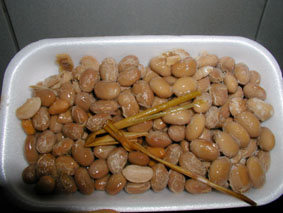 昨日の納豆の出来ですが・・・・大成功!でした。子どもに散々いじられたので(とってもいいことなのですが)温度が下がってしまってあんまり粘らないかなあと心配していましたが心配ご無用。しっかりと糸をひきましたよ~~。初めてにしては上々ではないでしょうか。なんだか来年の雪納豆作りがにわかに楽しみになってきました(笑) 真ん中に見える藁は「おまじない」といいます。良く粘りますように・・の願いを込めて・・・中から納豆菌を定着させるように(藁には納豆菌がついているんですよ)一緒に入れます。 こんなに糸を引いてます~~~♪