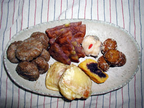 農協女性部の活動の中で研究会なるものがあります。当地域ではいまのところ凍み大根と雑穀の研究会。雑穀の方は立ち上げたばかりで今日が初めてメンバーと顔合わせをした日でした。でも、せっかく集まることだし・・ということで雑穀料理を持ち寄りましょうということに・・。私以外はベテラン母さんたちばかり。今回は持ち寄りということでおやつがわりになるものが多くなりましたが、いろんなものが出来上がってきました。 雑穀というのは米・麦以外のものだそうです。ので、小豆や大豆も雑穀に入るんですよ。左端から時計回りに紹介しますね。・残りご飯とそば粉をいれてじゅうね味噌(エゴマの味噌)をつけたお団子・つぶし豆を古代米入りの米粉にくわた揚げせんべい・アマランサス入りマッシュポテトの茶巾絞り・枝豆の香りと色合いがきれいなドーナッツ・かぼちゃとブルーベリーをそれぞれに練りこんだ生地であんこを包んだおやき・当地域で食べられるビスケットのてんぷら(これは雑穀料理ではありません)この頃では「スイーツ」という言葉が使われますが、今回のものは「おやつ」というのがピッタリ!私はスイーツも良いのだけれど、生活に馴染んだ台所にあるので作りましたというようなおやつに心ひかれます。どれもおいしかったですよ。この会の中だけにとどまらず、色んなお家のいろんなおやつ、昔のおやつを知ってみたいなあと思いました。