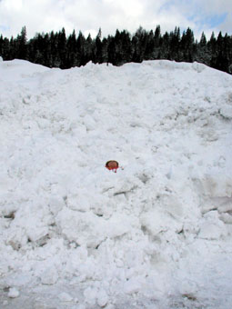 これが何の写真かわかりますか? ズームアップ・・・・・ 答えは除雪車で作られた雪山に寝そべる我が娘でした~♪スノーダンプで雪かきをしていると自分の上にのせてと要求。結果、顔だけのぞく姿になりました。本人はものすごく気持ちよさげに空を眺めていました。私もつられて除雪の手を休めて娘の横にゴロリ・・・ すると、雲がゆっくり風に流されていくではありませんか・・・あ~~気持ちいい~~。束の間の素敵な休憩時間でした。もう少し、ゆっくり見ていたいものの雪もたんまりたまって、明日からも予定がつまっているし、息子は具合が悪いし(この時は寝ていました)でなかなかゆっくりも出来ず・・・娘といっぱい遊んであげたいけれど、結局雪かき中心になってしまうのでした~。