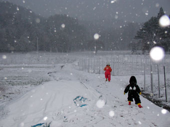 とうとう雪が降りました~!とはいっても初雪は13日の夜でした。夜遅めに帰ってきた車中で雪が舞い落ちるのをチラッとみたんです。ところが今日は一気に冬になっています。風も強く寒いです。畑のことを思うとまだまだやりたいことがあるのでこれが根雪にならないことを祈るばかり。そんな親の思いをしり目に子どもたちは大喜び。「やった~~~~!雪だ!やった~~~~!!」かなり嬉しそうです。これから積もる一方なのに・・・(笑)早速、寒空の下すでに真冬並みの防寒着で外に飛び出しました。雪をにぎったり、雪の上に寝転んだり・・・「わあ~~!桜みたい!!!」と娘。ヒューヒュー風にのって舞い降る雪に感動の一言。春はまだまだ先なんだけどねえ・・・(笑)。でも、本当に嬉しそうでした。かなり寒くて家に戻った時は顔が凍りついて鼻水がダラダラでしたが目はキラキラしていました。やっぱり子どもですね。これから完全に雪がなくなるまで5ヶ月はかかる長い冬が始まります。確かに大変な面はありますが楽しく暮らしていきたいと思います。こんな天気でしたので、もういい加減衣替えをしなければ(まだしていなかった・・・)いけないと今日セッセとしていました。その横で気が付けばどこからか水着を見つけ嬉しげに娘が身につけていたり、毛糸の帽子のかぶりっこが始まったり、ダンボールに入っていたり、押入れに隠れたりしていました。 今の時点で外はかなり積もっています。明日の朝は一面真っ白でしょう。子どもたちがなんて言うかなあ・・・楽しみです。