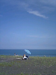 今日は朝から実家のある苫小牧へ!!兄(のんのんといいます。あずの2コ上)のお嫁さんに、『港まつりだし、遊びにおいでよ~♪』と言ってもらってたので楽しみに出かけました。なのになのに、、、ついたら予定変更で、兄のサーフィンのお供をする事に(T_T)久々のお天気で、テンション上がった兄。。。突然の変更に申し訳なさそうな兄嫁、、、・・・なわけで港まつりに行けなかったの、、、ううう。兄ちゃんおいて、二人でお祭り行こうよッ!!と兄嫁に訴えたものの、そこは新婚ですわ。。。 はう。・・・そして白老の海へ。お天気よし。サファーも数名。砂遊びする家族もちらほら。あずはローソンで買ったおにぎりを食べつつ、兄嫁の新婚おのろけをBGMに、さっぱり波に乗れない兄をただひたすら眺めておりました。(泣)せっかく来たんだから1回ぐらい乗らんかい!!!と念力を送りながら…。 ビーチパラソルの下の兄&兄嫁。 幸せそうなので良しとするか。。。 兄ちゃんを末永くよろぴくです。