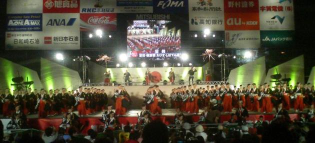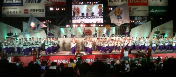 テニスをしたメンバー(広島からの参加者は翌日地元のテニスのため不参加)で夕食後、後夜祭を見ました。10・11日の本祭での入賞チームが踊る舞台でした。のんびり食事をした後だったので、後半の銀賞のチョイ手前審査員特別賞の途中からみれた・・・・ってドロワーズ見そこねたんですよ・・・高知のテレビ局のチーム唯一県外からの入賞 武州帯屋町筋写真は一緒に見ていた一番背が高い人に撮ってもらいましたこの時は人の頭しか見えなかったんですよ・・・・徐々に前に進めたけど・・・**************ぼそぼそ 阿波踊りが全国でお祭りの踊りとして使われているのを知らない人が居るのも少しびっくりしたのですが・・・ ソーラン節が増えてるのは知ってるって・・・・ 元は高知のよさこいだって事は知らないんだろうなぁ