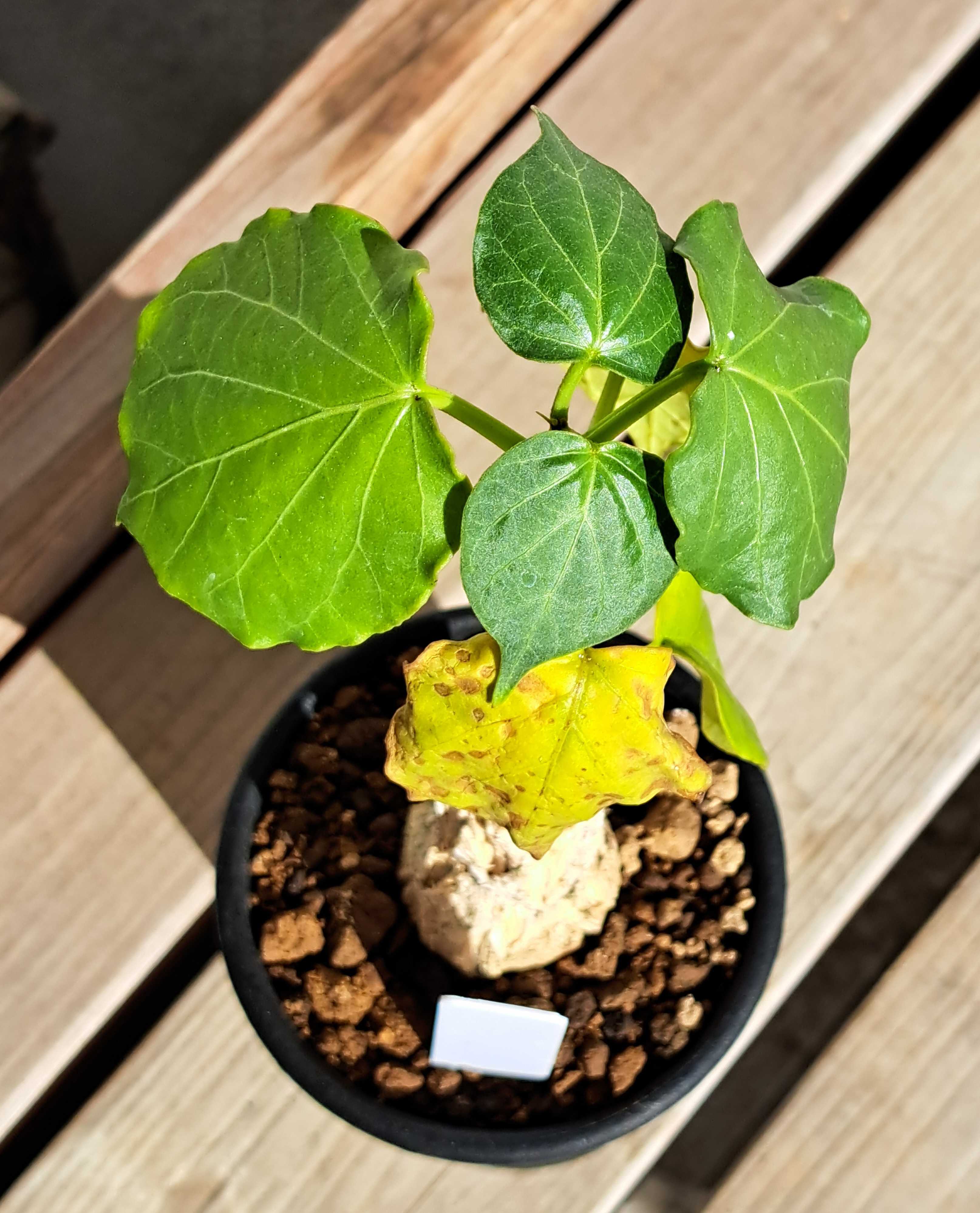 葉が全然デカくならないので2号→2.5号に鉢増ししさらにやや深埋めしたもの。