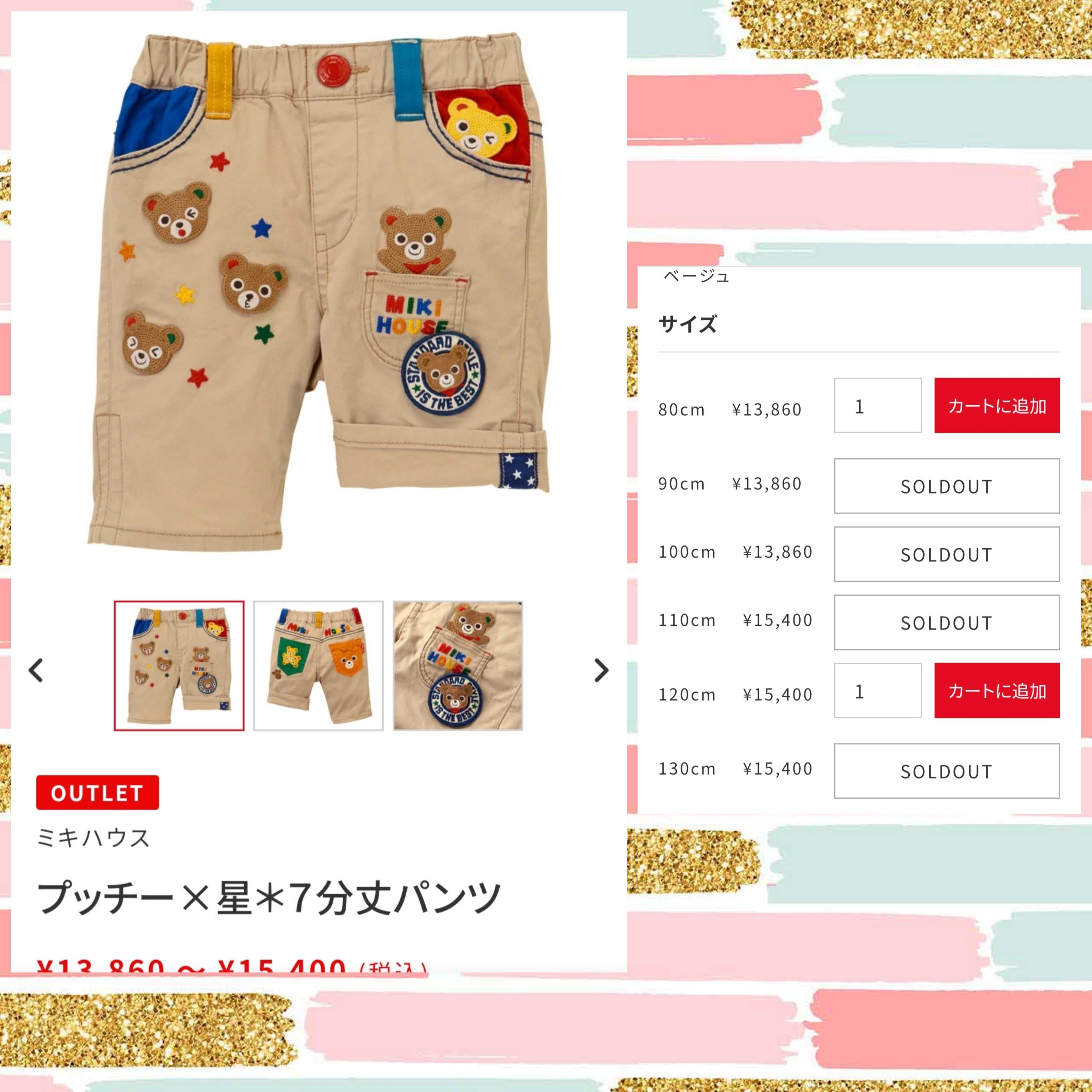 10:00ジャストに欲しかったパンツを確認したら、なんと110サイズはなし!(笑)元々アウトレットに降りてくるのは少量だったのかもですね…😂😂(笑)スタンバって損したよ😆(笑)120サイズがあったので、とりあえずカートに入れ決済画面眺めてました…😆(笑)が、120履くのって、ミキハウスさんの対象サイズ見ると5~6歳なんですよねーー👀こんな可愛いデザイン、絶対似合わない😂(笑)なので、ポチるのやめました。他ブロガーさんが待ってたら出てきたからポチったって書いてあるので、私がカートから消したやつですね…😂😂(笑)まぁ、90.100サイズ買ってあるからどうしても欲しい!とかでは無かったのでアレですが(笑)とりあえず、取置きあるし今週リプロに行こうかなーー。でも、アウトレットよりも新作のプッチー総柄リラックスパンツポチりたいです。↓可愛いですよね☺️❤️Tシャツと上下で着せてプッチーだらけにしたい😳❤️MHパークさんのクーポンは20日までですよー😆💨【送料無料】2022年サマーパック ミキハウス 1万円福袋 ★ウエア合計4点以上★ オリジナルショッパー入り【男の子用】【女の子用】【全国送料無料】2022年新春 ホットビスケッツ 1万円福袋 ★防寒あり4点セット★ オリジナルトートバック入り【男の子用】【女の子用】80cm〜120cm ミキハウス