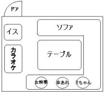 <2006年 2月合コンネタより こぼれ話> 前回の記事 前回ほんのり名前が登場した KICK THE CAN CREW 男ですが・・・。この男の合コンテクを、私は見逃さなかった・・・ 彼はすごかった。今までの合コンであんな自然に?(いや、私が気づいたから不自然か)ターゲットに近づく人ははじめてみましたよ・・!!! 2次会のカラオケ開場についた私たち(女幹事、私、Rちゃん)は普通に席に着きました。こんな感じに。 で、その時キック男がなぜ、ドア付近の1人イスに座っているのか、少し不思議に思っていました。でも、その謎はすぐに解けました!!!彼のターゲットが部屋に入り、Rちゃんの横の席に着いた瞬間彼はおもむろに動き、ターゲットの隣をGET!!! 尚且つ!自分で壁を作り、他の男が入る隙を与えないと言う力技!!!きゃ~~~~!!!すげ~瞬間見ちまった ・・・例えば、キック男がRちゃんの隣に座ってターゲットを待っていたとしたら、中田や私のタイプの男がターゲットよりも先に部屋に入ってくる可能性もある。そしたら、自分(キック男)は男の隣になってしまう・・・。が、もし自分がドア付近にいて、いつでも動ける状態だったら、9割がたターゲットの隣はGETできるという・・・。 (1割は、ターゲットが男と一緒に(ぴったりくっついて)部屋に入ってきた場合のみ失敗ですね。) いや~~~すごい。あんなの見たこと無い!笑(てか、分かりやすいのかな。うん。) 私はあんまりその場でカップルが出来る合コンって行ったことが無いので、よくわからないのですが、こうゆう策略?戦略?ってけっこーあるのでしょうか?見たことある方、実践したことある方、ぜひ教えてくださ~い(^^) ★★★★★★本家ブログはコチラ★人気blogランクに参加してます クリックお願いしま~す♪