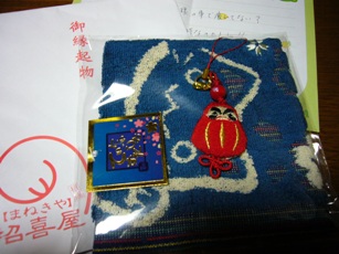 design++dalu+++++●●+++今日は長男○○の21歳の誕生日~~!!おめでとう!!(〃^∇^)o_彡☆早いものですね~いつまでも子どものままじゃ居ないね~!(´▽`*)アハッ母からは何のプレゼントも無しφ(≧。≦)メールだけね!!(´▽`*)アハッ娘は何か贈ってあげたみたいね~!優しいこと~ね!^^何を贈ったのかなぁ~~o(*^▽^*)o 私はプレゼントを贈らなかったけど・・・なんと~プレゼントが来てました(〃^∇^)o_彡☆うれしい~(〃^∇^)o_彡☆ブログの友のtonちゃんから~!!ありがとうね!!^^tonちゃんは私と同じくらいの娘さんを持つお母さんなのだけど(私より若いφ(≧。≦))、認知症気味の義母、病気のお父さん、お姉さん、姪御さん・・と沢山の身内の介護を一人で頑張ってるのよ!!そんなtonちゃんから~~縁起物の招喜屋さん(京都のおみやげだって(〃^∇^)o_彡☆)から縁起物のだるまのストラップと可愛いネコちゃん模様のハンカチ~そしてお手紙が(〃^∇^)o_彡☆ありがとうね!(〃^∇^)o_彡☆明日は母の手術です!!今週は病院に付き添いをします。日記も少しおやすみだね!!書き込みにコメントが出来なくて~ごめんなさい!!皆のところにもなかなかお伺いする事が出来ないね~(--;) 落ち着いたらまたお邪魔しま~~す!!^^ ::: Happy Selection :::