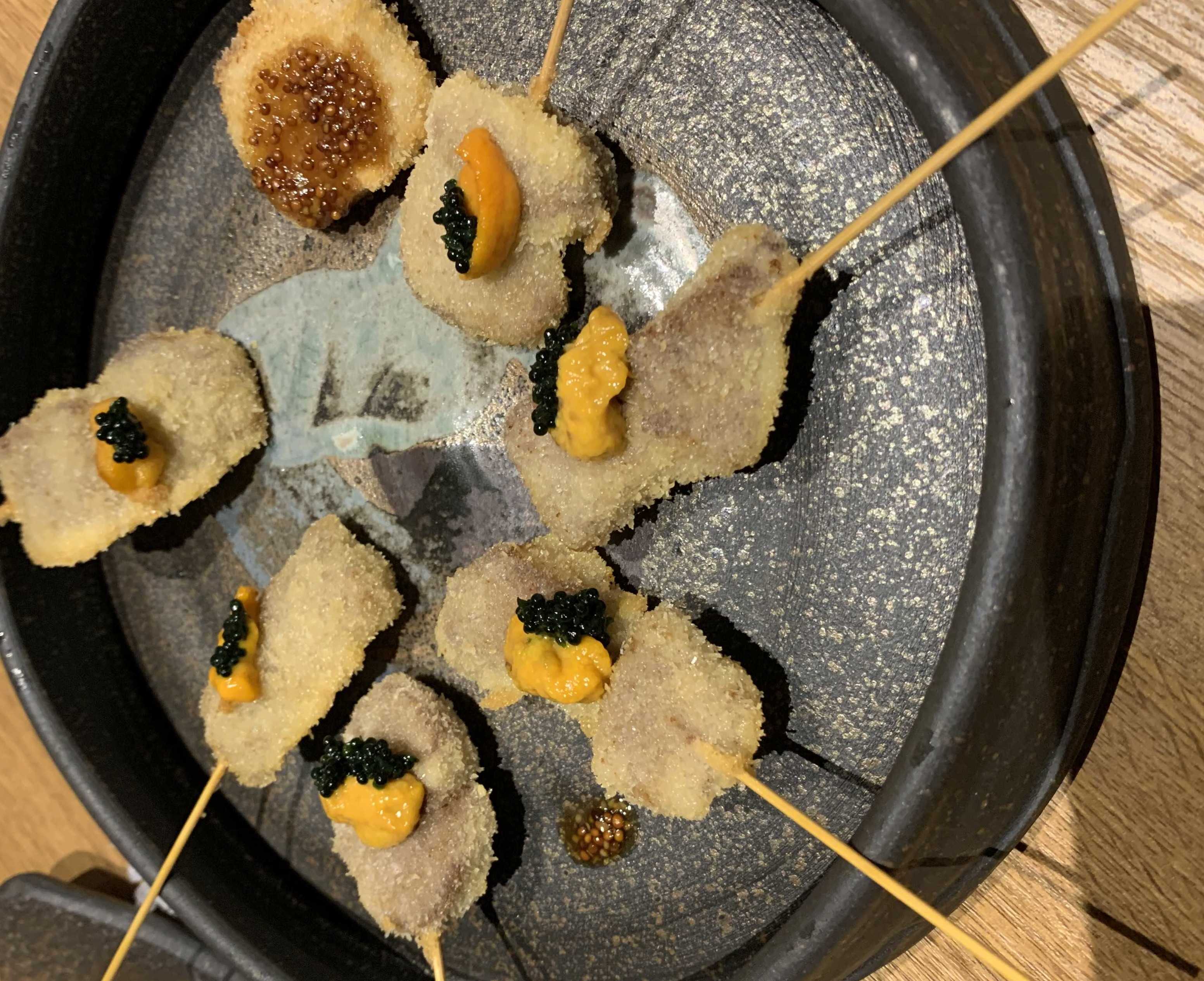3度の稽古と宴が大好きな三年坂バンド、前回、夏は焼肉、秋の今回は、串揚げです!!わ~~~い前から行きたかったお店「串ハル」さん、日航ホテルの裏通りにある、グレーのコンクリートのモダンなビル1階。急に降り出した雨の中、逃げ込むように入店wwいやいや、食べる前からもうよいではないかよいではないかメインの串はエビ・ウニ・キャビアにあそび豚、他にもピザやレンコンチップスサラダや台湾ラーメン、デザートに杏仁豆腐、ああ、すいません、毎日来てもいいですか??(お金あったらw)おまけに、東京や大阪万博に行ったメンバーからのおみやげまで頂戴し、盆と正月が一緒に来たかのニンマリニタニタが止まらないw次回の稽古から、3ヶ月ぶりに源じい殿(T.sax)も復帰ということで、さらに盛り上がった宴であった。唯一、せっかく減少気味だった体重が、翌朝、一夜にしてリバウンドしとったのだけが悲しい・・・。あそび豚の上にウニとキャビアがトッピングされた串。贅沢すぎるとおもうものの、一口で終了ソースだぼだぼの串揚げとは異なるのに、1本1本じゅうぶんにうま味があり、胃もたれしません(我ら中高年にちょうど良い)台湾ラーメン、って初めてわんこそばみたいに何杯でも食べたいきのこピザ、「きのこ」というだけでなぜか罪悪感なく食べられるピザ。うまいw