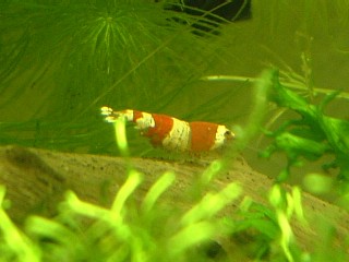当然ですが、別れがあれば出会いもある。昨日は暗い話題で恐縮でしたが、今日は新しい命の誕生です♪久々の「エビ」ネタですが、ようやく、ようやく稚エビが誕生しました♪まずは、親の赤ビーから。卵持ってるの分かりますかねぇ?こっちの方が分かりやすいかな?で、今日帰って来て水槽に目を凝らすと・・・ん?何だこの「点」は。さらにジーーーーーーッ。はっ!稚エビやん♪小さ過ぎて、全然ピント合いません(^^;すると、もう一匹♪こっちは流木の上に単体でいたので、さっきよりはピント合いました。すると更に・・・黒稚ビーまで♪いやぁ~、嬉しいなぁ♪エビ専用水槽を立ち上げて4ヶ月。やっと、稚エビを見る事が出来ました。よく探すと、赤ビー黒ビー合わせて稚エビは5匹いました。多分、水草や流木の陰に、20匹近くはいると思います。果たしてこの中で、何匹が大きく育ってくれるか。更に、上の画像にあるように、赤2黒1が今も抱卵中。こんな時期に出産ラッシュとなりそうな、嬉しい誤算です。餌にむらがるエビ団子が見られる日も近い・・・かな?