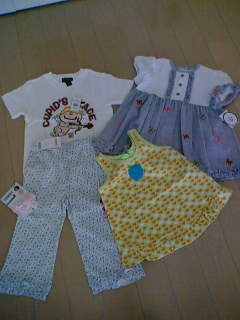 先日購入したTICKTACKさんのブランドミックスの福袋が届きました。TICKTACKさんは初めて利用させてもらうのでどんなものが入ってるんだろうかと思ってドキドキしてました。●latteseccoのタンクトップ●JCpenneyのワンピース&ヘアバンド●THECHILDREN'SPLACEのTシャツ●GYMBOREEのパンツ●GYMBOREEのリボンの髪留め送料、代引き手数料込みで5,250円でした。私的にはタンクトップとパンツは◎かなぁと。自分ではなかなか買わないだろうな~と思うものでした。ワンピースはお出かけにはいいかもしれないです。早く着せてみたいけど、全部夏用なのでもう少し先になりそうです。夏物の福袋はまだまだ今から出そうです。福袋CHECK