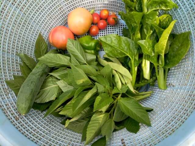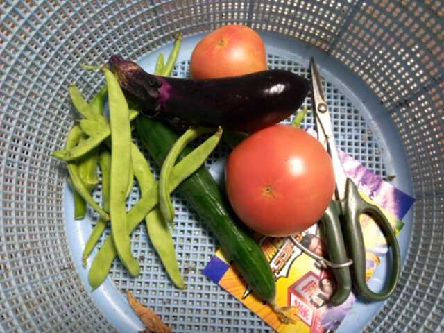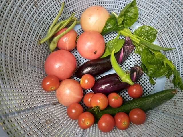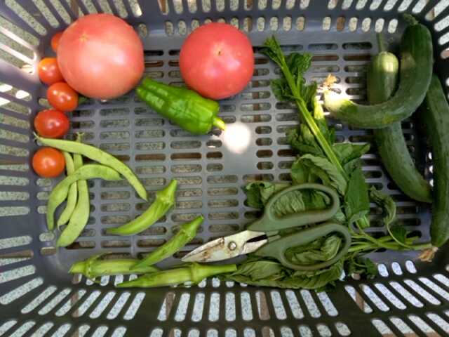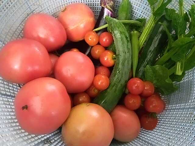 こんにちは。今日は晴れです。今日は○夏野菜の収穫○です。△夏野菜の収穫△大玉トマト2個、ミニトマト5個、キュウリ3本、ピーマン1個、オクラ4本、平鞘インゲン豆4本、ツルムラサキ2本、モロヘイヤ収穫しました。種まきした地ばいキュウリに水やりしました。トマトは下葉欠きしました。オクラも下葉欠きしました。畝間に注水しました。ナスがほとんど採れなくなってしまいました。キュウリとトマトに挟まれ太陽が当たらないためでしょう。キュウリがもう少しで終わりそうなのでキュウリを撤去したら大丈夫だと思います。挿し木したバラに水やりをしました。明日は、実家の畑に行こうと思っています。気温が高いので朝早くいく予定です。スイカとトマトを収穫するのがメインです。割れていないとよいのですが・・・。今日の日本株は休みです。今日の予報は最高気温33℃、最低気温26℃です。かなり蒸し暑かったですね。今日もつたないブログに来ていただきありがとうございました。「花、ガーデニング」「菜園」部門に登録しています。ガーデニング初心者ランキング家庭菜園ランキングにほんブログ村↑一日1回クリックして戴けると嬉しいです。家庭菜園夏野菜の収穫