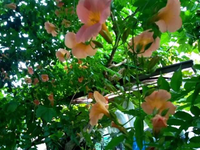 こんにちは。今日は晴れ時々曇りです。今日は○ノウゼンカズラ○です。△ノウゼンカズラ△結構咲いてきています。毎日水やりが忙しいですね。この草花のおかげでだいぶ涼しくなっているようです。日よけのためでこんな感じになっています。△玄関前の花△玄関前は上にはノウゼンカズラが来ていますがそのほかにブドウ、琉球朝顔、九尺藤があります。下にはシュウカイドウと木立性ベコニア、インパチェンスの花が咲いています。△インパチェンス△こぼれ種が発芽しています。バラの葉の日陰になるのでちょうどよい光の入り具合になります。△夏野菜の収穫△キュウリ4本、ナス2本、トマト1個、ミニトマト3個です。今日もみう槍に貸農園に行ってきました。野菜が良く採れます。今日の日本株は休みです。今日の予報は最高気温34℃、最低気温26℃です。とても暑いです。今日もつたないブログに来ていただきありがとうございました。「花、ガーデニング」「菜園」部門に登録しています。ガーデニング初心者ランキング家庭菜園ランキングにほんブログ村↑一日1回クリックして戴けると嬉しいです。花家庭園芸家庭菜園