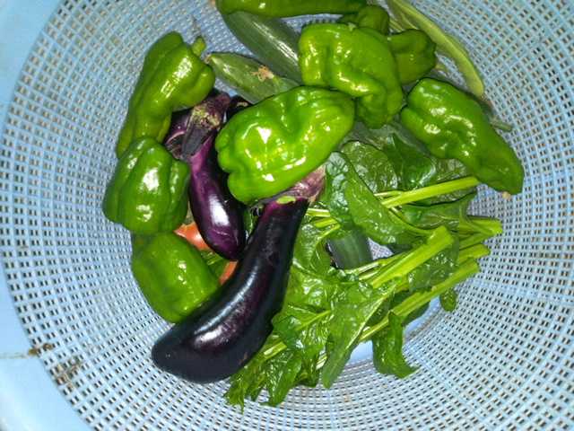 こんにちは。今日は晴れです。今日は○夏野菜の収穫○です。△夏野菜の収穫△ピーマンが7個とツルムラサキが5本採れました。いずれも2本しかない木なので一杯取6れたということです。△夏野菜の収穫△トウモロコシ6本と春菊が採れています。トウモロコシは貧弱なので実があまり入っていないでしょう。△夏野菜の収穫△キュウリが7本、ナスが5本、大玉トマト、ミニトマト各2個平さやインゲン3本でした。化成肥料がなかったので追肥はぼかし肥だけでしたが実家に行ってもらってきたので畝間に追肥しました。トマトは虫に食べられて穴が開いている被害が頻発です。木酢液でもかけようかと思っています。ぼかし肥に虫が湧いたので天日干しをしました。今日の日本株はPF542千円(前日比+4千円)でした今日の取引はありませんでした。今日の予報は最高気温33℃、最低気温27℃です。暑かったです。今日もつたないブログに来ていただきありがとうございました。「花、ガーデニング」「菜園」部門に登録しています。ガーデニング初心者ランキング家庭菜園ランキングにほんブログ村↑一日1回クリックして戴けると嬉しいです。家庭菜園トウモロコシツルムラサキピーマン春菊トマトキュウリナス