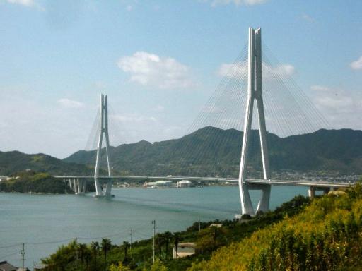 10月8日(日)日和がいいので予定通りムーヴでドライブに出かける。国道2号線を尾道まで走り、しまなみ海道に入り愛媛県今治市大三島へ向かう。しまなみ海道は平成の大合併で、尾道市(向島、因島、生口島)と今治市(大三島、伯方島、大島)となってしまった。その生口島と大三島を結ぶ県境に架かる多々羅大橋の広島側に瀬戸田PAがある。多々羅大橋の撮影にもってこいなポイントである。 この多々羅大橋は全長1480m 中間支間長890mの世界最長の3径間連続複合箱桁斜張橋である。フランス・セーヌ川に架かるノルマンディー橋と姉妹橋を結んでいるそうである。放射状に無数に張り巡らせてあるケーブルは7mmの鋼線を151~379本の束にしている。吊り橋と違って斜張橋の場合、中間で2本の塔が支えているため、大きなケーブルは必要ない。 多々羅大橋のケーブル 直径約18cm ちなみに北備讃瀬戸大橋のケーブルは約1mだった。表面はレインバイブレーション対策ディンプル形式(ゴルフボールと同じ凸凹が作られれている)で、雨風から保護されてある。 さて、この後多々羅大橋を渡って愛媛県に入る。明日に続く・・・。