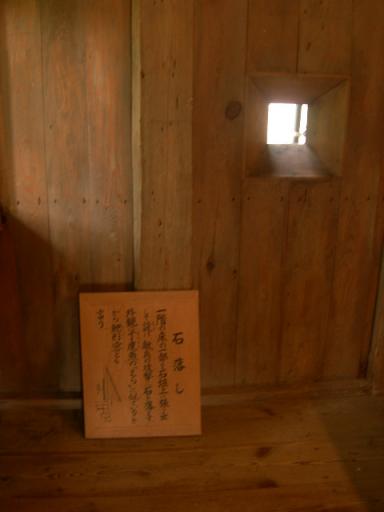 さて「はぁ~しんどい。」を連発しながらも、天守閣に到着。山城だけに大きくはないが、風格が漂っている。山城というと皆さんはどのようなイメージを持つだろうか?兵糧攻めや長期戦に難がある・・。確かに町を制圧されると逃げ場がなくなりる。しかし・・。たとえ包囲されてもそう簡単には落せないのも山城なのである。包囲されると弱いとはいえ、逆に敵の動きも察知しやすい。そして自然を味方にした要塞はそう簡単に突破出来はしない。城の中にも敵を寄せ付けない様々な仕掛けが存在する。今日はそれらの写真を見てもらおうと思う。 石落しその名のとおり近づいた敵に投石する。といっても小さな穴から石を落とすのではない。写真の小窓はあくまで覗き穴で、実は扉になっていて(下を押すと開く)そこから大きな石を落とす。 武者窓城の窓の格子に使われている。外側の面が平らなのに対し、内側は三角形になっている。これによって外側からは中が見えないのに対し、内側から外の動向はよく見えるのだ。武者窓から外を見ると・・。 狭間(ざま)上戸になっている覗き穴から弓矢、鉄砲で曲者を待ち伏せる。上戸の先はふたのようになっているのは、敵から見えにくいようにするだけでなく、狙いを定めやすかったそうだ。見事敵に命中!!「してやったり!」これが本当の「ざま~~みろ」(しら~~~)そのほかこんなところも・・。 装束の間文字通り落城したときに城主はここで自刀したという。毛利輝元に攻め込まれた三村元親もここで自刀したのだろうか・・。 天守閣の骨組みどうです??山城ってそう簡単に攻略できるものではないということがお解りいただけたと思います。決して守備的なのではなく機動力型のお城であるということも・・。 スタンプ坂路調教をクリアしてゲット!!