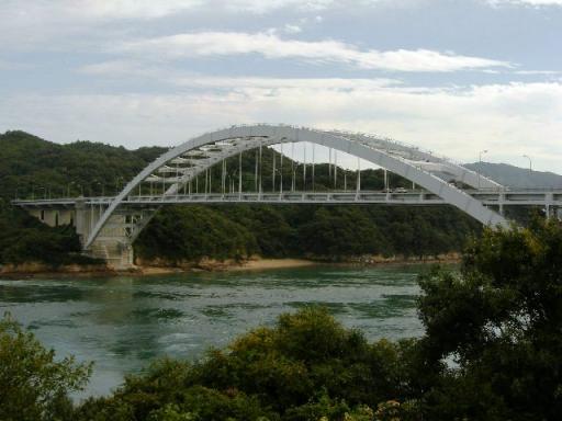 大三島橋 ↑大三島・尾道方面 ↓伯方島・今治方面今回のサイクリングで唯一渡った大三島橋について少し解説したい。多々羅大橋、伯方島・大島大橋、来島海峡大橋にくらべてどっしりとした感じのする大三島橋。それもそのはず、昭和54年生まれ(つまり54年完成)のしまなみ海道の先駆け的存在なのだ。全長328mだが、ソリッドリブアーチ橋の中では日本一長い。潮の流れの急な「鼻栗瀬戸」に架ける工事は困難を極めたという。その鼻栗瀬戸の急流を美しい曲線でデザインするために、アーチ橋が選ばれたそうである。しまなみ海道は昨年末にムーヴで通ったのだが、写真が撮れたのは来島海峡大橋だけ。そんなわけで、せっかくのサイクリングの記念に撮りたかったのだ。しかし・・。今日の「ザ・鉄腕DASH」で思い切り映ってるぞ、大三島橋が・・・。なんか、思い切りインパクトが弱いかもしれない。 鼻栗瀬戸と大三島橋 逆方向から・・。8ノットの潮の流れが実感できるぜ・・。