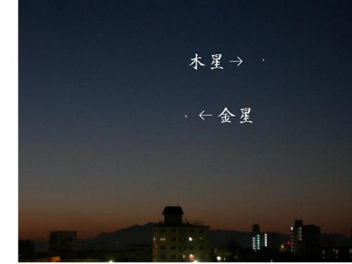 趣味の天体観測も、長いことやっていない。やろうと思っているのに、気が付けば星を見ることもめっきり少なくなってしまった。試験や家に帰ってからの残業も増えたのは事実だが、時には星を眺めるゆとりは失いたくないものだ。今、夜明け前の南東の空が賑やかである。日の出前の青から赤へ変わろうかとしている時間でも、はっきりと存在感をあらわしている。2月8日 6時15分ごろの広島市内の南東方向の空明るいほうの星が金星、その金星と競うように明るく輝いているのが木星なのだ。実は両者が再接近して見えたのは、1週間まえの2月1日のこと。そのときは金星のほうが高い位置にいたのだが、今は木星のほうが先にあらわれる。両者は次第に離れていき、木星はだんだん地球との距離を縮めていく。金星は逆に太陽の後ろ側に隠れようとし、6月9日に外合となる。補足 外合= 水星、金星が太陽をはさんで、地球と正反対に位置する。当然外合とその近くの日の観測は不可。外惑星(火星、木星、土星、天王星、海王星)は合という。さらに補足すると、水星、金星は太陽の内側で合となることもあるので(これを内合という)外合、内合と呼ぶ。逆に地球を軸に太陽と外惑星が正反対に位置するのを衝という。このときが外惑星の観測の最大のチャンスになることが多い。ただし、地球との距離が最短になるとは限らない。と、ややこしい話しはこのくらいにして(ブーイングが聞こえる)天気のいい夜明け前、ちょこっと東の空の木星と金星の競演をお楽しみください。