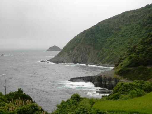 さて、おいらのムーヴは、国道191号線を下り萩方面に向かう。途中、国道315号線に進路を変え、萩市片俣にある道の駅を目指す・・・はずだったが、315号線に入ってすぐ、ある標識を見つける。「ホルンフェルス大断層 ←4km」なにやら断崖絶壁の絵が描いてあるのだが、しばらく行くと須佐湾に辿り着く。先ほどの断崖絶壁の絵とは裏腹に、穏やかな入り江が広がる。ただし、このあたりの道路は海抜50cmもないようだ。しばらく走ると、急に上り坂になり、また走ると、今度は下り坂・・・。そして辿り着くと、お馴染みの荒くたい日本海の光景が広がる。 須佐ホルンフェルス大断層ところでホルンフェルスとは何やねん・・・???実はおいらも知らなかった・・。そもそもの語源はドイツ語で「角石」(Hornhels)岩石を割ったら、角ばって割れるのでこの名がついたそうだ。なにやら断層面が白と黒のきれいな縞模様になっているが、この縞模様は日本海の荒波が造り上げた、自然の彫刻とはまた違う。この須佐のホルンフェルスは「変成岩」による大断層なのだ。一般的に岩石は堆積岩、火成岩、そしてこれらの岩石が何らかの強力な力で、元の岩石と性質や成分が異なった「変成岩」に分類される。この須佐のホルンフェルスは、約2000万年前の砂岩や頁岩といった堆積岩層だったのが、1400万年前の火山活動で、火成岩層が侵食してきた。(この近くの高山はこの地殻変動で誕生したという)このときの強力な熱と力で変成岩層が誕生、これがホルンフェルスとなったという。そして仕上げは日本海、この自然の彫刻で、断崖にこんなきれいな断層を造り上げたというわけだ。ん!?こんな話を聞いたら眠たくなった???じゃ、おやすみなさい。起きている人は、ついでに写真を見て帰ってください。 昼までは夏の晴天だったのが一転、道の駅「ゆとりパークたまがわ」を過ぎたあたりから雨が落ち始める。さすがにこれでは下まで降りることはできなかった。 続く・・。(おいらもくたびれたのだ)
