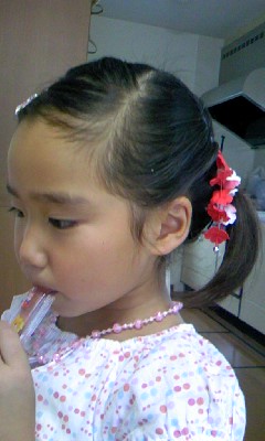 夕涼み会前に髪をセットした写真と、今日わざわざお誕生日プレゼントを届けてくれたお友達からのお化粧セットで早速ぬりぬりする姫っこを。