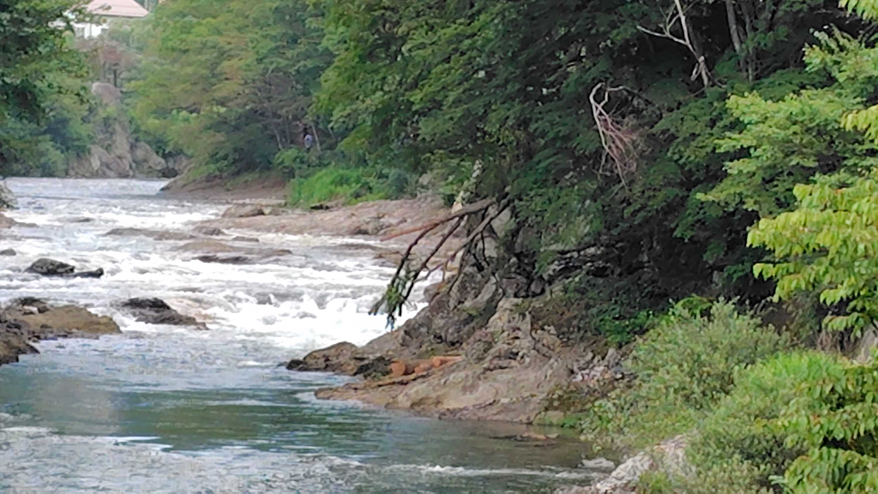 近くまで行くと、数本にカットされた倒木の残骸が河辺に積み上げられていました。