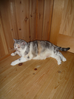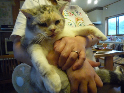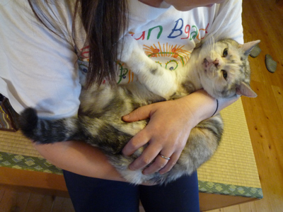 奥さん、朝からみーちゃんをいじります。二人の会話がはずみます。奥さんたまらず、みーちゃんをだっこ。みーちゃん、しあわせそうな表情を浮かべます。