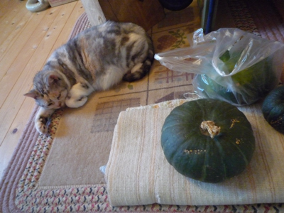 手前2つのかぼちゃは、うちの畑でとれたもの。向こうのポリ袋入りのかぼちゃは、職場の同僚にもらったもの。みーちゃん、かぼちゃさんたちのそばで寝転がるのも大好き!