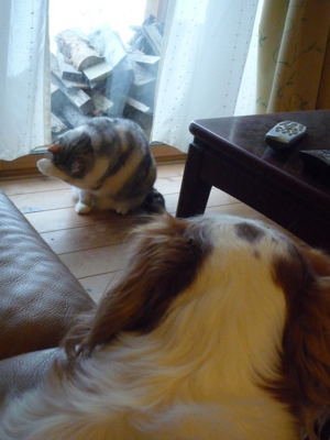ゆうべは、寝床に入ってからも外は強い風がふいていた。今朝、起きてみると20センチくらいの新たな積雪。みーちゃんは、ルナたんがソファに居る時は遠回りして歩いている。ルナたんがいなくなると、すかさずみーちゃんが石油ストーブの前の特等席に着席。