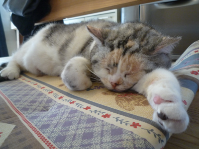 みーちゃんの後ろ足って、こうして下から眺めてみると長いんだねえ。あなたがキャットタワーに駆け上がる、無音のしなやかな動作には、いつもほれぼれするよ。ルナたんは、せいぜい階段やソファの上にジャンプするくらいだ。でも、ベルベットのような体毛の手触り、腰のくびれのセクシーな感触には、ぞくっとするぞ。ツイッターは、小池百合子さんのを読んでみた。彼女の属する政党にはまったく興味はない。しかし、私的なつぶやきは、まあまあおもしろい。TVレポーターの、どうでもよいコメントより、当事者のつぶやきの方が価値があるようにも思える。村上春樹さんのツイッターも読んでみた。1~2行のつぶやきだけど、ちゃんと村上ワールドを形成している。示唆に富んでいて楽しい。奥さん経由の情報によれば、東京のまごのみもざちゃんと両親が来週木曜にANAのジェット機で飛んでくるそうだ!昨年、パリ・ロンドン旅行の帰り、関西空港から大阪市内のJR駅までご一緒していただいた大阪在住のご婦人は、富山人がのけぞるようなことを、ぽろっとおっしゃった。(^^;)『えっ!!富山にも空港が有ったんですか?』富山空港と羽田空港を結ぶ路線は、まあまあ良好な搭乗率なんですよ!夢みたいなことを言えば、富山空港からダイレクトに成田空港と結んでくれたらいいのになあと思う。成田発着の海外旅行(ツアー)の代金の安さかげんに、いつもため息ついている。そういう時だけ、千葉県の住民になってみたいと思う。