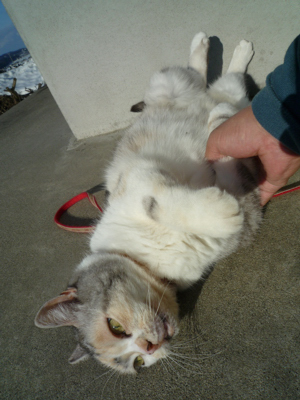 昨日の日曜日。一日中快晴で、ぽかぽかと暖かい感じがした。午後、BIRD邸の南側の犬走りの上で、みーちゃんとひなたぼっこをした。みーちゃん、超久しぶりの外のお散歩。雪がほぼとけて、草も地表に姿を表していた。みーちゃんは、サラダ感覚で草を食する。繊細でお上品なお食事風景である。犬走りのコンクリートは太陽に熱せられて、岩盤浴効果。みーちゃん、喜びまくってぐるりんぐるりんと背中をこすりつける。BIRDが手を出しているが、一部やらせの写真であることを告白する。(^^;)みーちゃんがコンクリート壁に両足つっぱっている部分は、やらせではない。