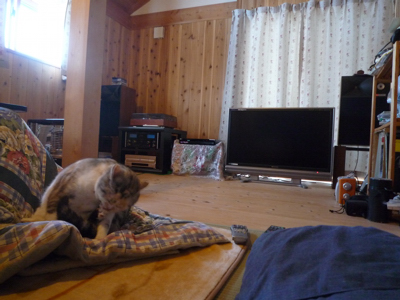 BIRDの部屋。手前にベッドがある。向こうにオーデイオ機器や液晶テレビがある。左から、JBLのスピーカー、マッキントッシュのプリメインアンプ、1テラバイトのブルーレイレコーダー、42型のアクオス液晶テレビ。BIRDにとってはかけがえのない宝物たち。家族たちはもちろん最高の宝物。こちらは2番目か?2009年にブルーレイと42型テレビを奥さんの了承をようやく取り付けて購入することができた。映画や音楽ビデオ(最近は主にクラシック)を鑑賞する時の迫力がたまらない!ノダメ・カンタービレ、マリと子犬の物語など、良い音響と共に楽しんだ。マリは、奥さんと一緒に鑑賞。奥さんも満足し、これだけの機器が存在することの意義をようやく理解してくれた。この家に引っ越したばかりの頃、キリスト教のソプラノ歌手の賛美(歌唱)をオーデイオで演奏した。一緒に聴いていた奥さん、涙で頬をぬらしていた。上質の音響や映像には、人の心をゆすぶるものが確かにあると思う。手前のこたつ布団の上で、みーちゃんがくつろいでいる。今朝の様子である。みーちゃん、初めてこたつ布団の中にもぐりこんでくれた。