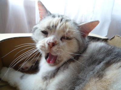 昨日は富山市でも最高気温が30度くらいまで上昇したようだ。職場には冷房はまだ入らない。クールビズ&節約モード。窓から微風が入って、助かったよ。それでも、ハンカチで顔の汗を数え切れないくらい拭いた。うちわも使った。今朝は、一転して、どんより雲っている。午前9時に、地元の電機屋さんが来てくれる。居間のパソコンに、バッファローの無線LAN、親機と子機の設置、設定をしてくださる。1時間くらいで作業は終了するでしょうと昨日の電話では言っておられた。これで、wifiルーターも活躍を始めて、iPhoneちゃんの圏外現象は自宅内で無くなるはず・・・・。BIRDの職場は富山市のど真ん中なので、3Gの電波はがんがんに届く。職場では絶対圏外にはならない。今朝のルナたん、カメラを向けたら大きなあくびをしてくれた。ASA1600で撮影してみた。シャッター速度が速めになって、画像がすっきりしたようだ。昔のフィルム時代の粒子の荒れた天体写真のイメージがつきまとっていた。現代のデジカメは、感度を相当上げても粒子が荒れたりしないんだね。