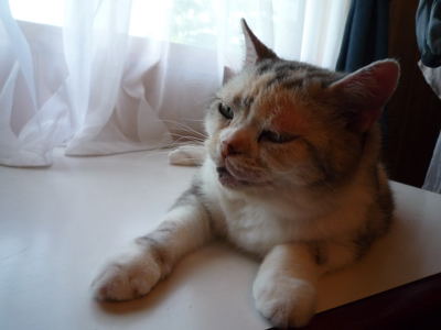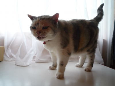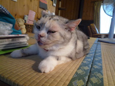 みー様は、客間のテーブルの上が一番のお気に入りだ。今風の言い方だと、モテイベーションが上昇する!!といったところらしい。バブル期のデイスコのお立ち台を連想させる。TVでしか見たことないけど。今風の言い方といえば。ブレる、という言葉、BIRDは虫酸が走るくらい嫌いだ。ブレア、という英国の政治家は知っているけど。ブレる、なんて言葉、誰が作ったんだろうなあ?『私はちっともブレてませんよ。』と口走る人がいる。終始一貫した、機械みたいな人間がいるんでしょうかねえ。矛盾を抱えながら、かっこ悪く生きるのが人間だと、BIRDは勝手に思っている。今朝、8時頃、BIRD邸の前の空き地で、またまた30分程、草刈機で草を刈った。1メートルくらいの草というより木を刈り取ったので、見通しが良くなって、向こうの風景がすっきりして気持ちが良い。朝の5時、6時に起床するので、そういう時間帯に草刈りだってしたいくらいだけど・・・。ご近所への騒音が心配。100メートルくらいは離れているけどさ。