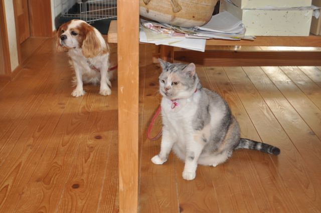 今月14日の午前10時頃の風景。BIRDは、電気工事の方に来てもらいました。1階の客間と2階のBIRDの部屋の照明器具を付け替えしてもらうため。1階の器具が、シャンデリア型で明るいんですね。それとは対照的に、BIRDの部屋の器具は、ちいさな電球1個で、非常に物足りないしろものだったのです。数年我慢し通しでしたが、ついに決意して、電話で付け替え依頼となったわけです。工事のおじさんは、1時間くらい家の中で作業しておられました。みーたん、ルナたんは、リードを付けて1階居間で待機させてました。知らない人が来ると、緊張する二人なのでした。