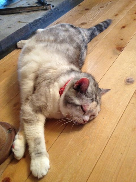 この写真は、6月28日のものです。みーちゃん、薪ストーブのそばでうたた寝してらっしゃいます。7月に入って、日中は30度に達する日もめずらしくありません。それで、例年通り、私達が留守中は、エアコンの冷房温度を27度に設定しておきます。みーちゃん、ルナちゃんが快適な夏を過ごせるようにね。私の職場は、まだエアコンは解禁になっていません。扇風機がまわっているだけです。自分のデスクのところでは、ノートパソコンから電源を取れる、USBのコード付きミニ扇風機が大活躍してます。昨年の夏に、980円で買ったもの。これが無い時代は、うちわでぱたぱたあおいでました。しかし、腕が疲れてくるんだよね。奥さんには、6月だったか、首のまわりにまく、ひんやりスカーフ?をネットで取り寄せてあげたけど、毎日使っているのだろうか?今度確認してみよう。昨日から、奥さんは、AQUOS PHONE(ピンク)を使用し始めました。テンキーが付いた機種なので、奥さん用にぴったりだな、と思い、こちらを選定となったわけです。フリック入力なんか絶対いや!!と、おっしゃってましたから。一昨日まで、私がiPhone3gsを購入するまで使っていた、AUのガラパゴス携帯を、おさがりで使用してました。かなりの愛着を持っていましたね。奥さんにも、Googleメール、Skype , LINE , ビデオ撮影などの機能を使ってもらわねば、ということで、多少の抵抗はありましたが、使ってもらうことになりました。スマホのユーザーになって2日目にして、奥さんも便利さが分かってきて、今では満足していらっしゃいます。これからは、奥さん、iMacだけじゃなく、自分のスマホ経由でも、孫たちとのテレビ電話を楽しむようになるでしょう。写真付きのメールを夫婦間、家族間、そしてスマホとパソコンの間で転送する際に、ガラパゴス携帯では役不足になってしまったんですよね。通話とメールだけしてる間は携帯はとても便利なツールだったんですが。AQUOS PHONEは、私が、楽天オークションから落札しました。おかげで未使用品を激安でゲットできました。ネットのオークションでの物品購入は、初体験だったので、けっこうドキドキしましたし、不安もありました。AUの店での機種変更は、2100円ぽっきりで、すんなり済みました。