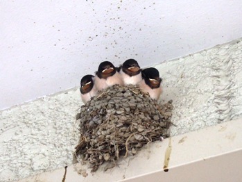 「燕」は春の季語。立秋も目前の、二十四節気上は夏から秋になろうかという今の時期からは、ちょっとかけ離れているけれど…。自宅とバス停の間、一階に店舗の入っているマンションの軒先に、いつの間にやらツバメの巣が掛かっていた。ヒナは全部で4羽。揃ってすくすくと大きくなっていくのを見るのは、毎朝の楽しみの一つであります。ということで、わざわざデジカメ持って、出勤(笑)。朝の撮影は、親ツバメがいなかったせいか、おとなしく口を閉じていた。でも、戻ってきた時の賑やかさといったら、もう(苦笑)。実はこの巣、店舗入口の真上にあって、さぞや音や糞に悩まされていると思うのだけれど、撤去しないでいる、その姿勢に、感謝感謝。昨今は、汚れたり虫がわくからと、巣を落としてしまう事が多いそうなので…。商売繁盛の印と言われたり、縁起が良いとされていたのにね。ご近所の方の立ち話を小耳にはさんだところでは、そろそろ巣立ちの時期とのこと。まだまだあどけない顔立ちだけれど、もう飛べるのかな?そして、今朝。空っぽの巣。昨日は午後から太陽も顔を見せたし、無事に巣立ちが出来たんだね。元気で、また来年、戻っておいでねー。