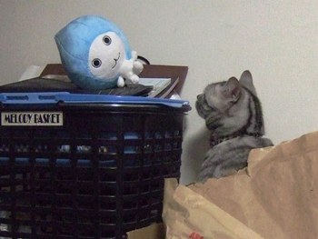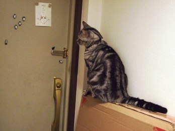 とある日の一こま。ぴちょんくん、ぴちょんくん、ボク、お願いがあるんだけど。・・・・・。ボクもそこに乗りたいんだけど、どいてくれないかな?・・・・・。・・・答えてくれないにゃ・・・(_ _;)。いや、キミが今いる、新聞入れ自体も、ほんとは居ちゃいけないとこなんだけどね(苦笑)。その気になれば強いのに、マロンにもしょっちゅうお気に入りの場所を取られちゃうダッシュ。優しいのは素敵なことだけれど、ストレスは溜めないようにね(^ ^;)。