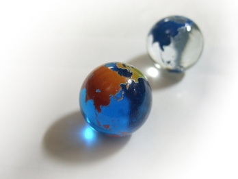 ワタシの日取りミスもあって、やっと都合をつけてのR嬢とのデート。どこ行きましょうね?桜はまだ満開にならなさそうだし・・・と、「花見」から舵を切って「観覧」へ。まずは、東京都美術館の『アーツ&クラフツ展』。ウィリアム・モリスの作品を中心として、イギリス~ヨーロッパ~日本の工芸品(?)の展示がされていて、とても見応え&歩き応え(苦笑)のある展覧会でございました。ウィリアム・モリスの自然界をメインとしたデザインパターンは、柔らかいけれど確固としていて、そのバリエーションの豊富さも見応えがあるもの。全体を通して、職人技を見せて頂きました、はい。2時間かけての観覧に、ちょっとへばって、ホテルオークラ ガーデンテラスでティータイム。お次は、東京国立博物館で『特別展「Story of …」カルティエ クリエイション~めぐり逢う美の記憶 』。日頃、いわゆるブランドには興味のないワタシだけれど、実はバーバリーとカルティエだけは特別。館内では「すごい」としか言えない自分のボキャブラリーのなさに涙しつつ、先刻からの職人技を、一層昇華したような繊細さ・緻密さにただただ感嘆するばかり。ルビー・サファイヤ・エメラルドを散りばめた「トゥッティ・フルッティ」シリーズは、食欲をそそられる彩りだったり、何百カラットという鉱石のインパクトに釘付けになったり。自然界が果てしない時間をかけて作り出した美しい鉱物を、人間の手によって、更に加工して輝かせる、その見事な産物。凄い、の一言しか出てきません、て。・・・ミステリークロックの上に、なにゆえ、「ビリケン」が乗ってるかは、謎だけど(爆)。こちらも、1時間半かけての観覧でした。足裏、痛いっす(_ _;)。9時の開館時間に合わせて観始めたのだけれど、両方終わって出て来た時には、すっかり昼下がり。満開ではないものの開きかけの桜の木々と、桜を口実に楽しむ人とで公園内は大賑わい。春だからねー。とゆーことで、本日一番の収穫は、こちら↓。国立科学博物館で購入した、地球儀ビー玉。ずーっと欲しくって、横を通りかかったので、ショップにだけ入れる入館証をもらって、ようやくゲット。ビー玉自体の色も、陸地の色も、それぞれ何種類かあるのだけれど、個人的にはやっぱり青がお気に入り。うふふふふ、カルティエのダイヤモンドの煌きもほんっとーに素晴らしかったけれど、ワタシには、こちらの方が身の丈に合ってるかもね(^_^;)。