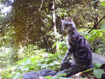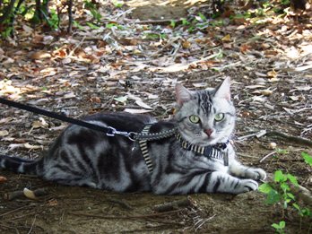風邪は冷たいけれど、日差しはぽかぽか~、という、本日のお散歩場所は、こちら↓。 ここ、初めてのとこだにゃ♪東京タワー真下の、芝公園(19号地)。ここには、人工ではあるけれどささやかな渓谷が復元されていて、地面もほとんどが落ち葉で覆われている。・・・写真だけ見ると、とても都心とは思えないけどね(苦笑)。雑木や滝、渓流、岩山や茂み。まさしくダッシュには打ってつけの場所。60度近くあるんじゃなかろうかという崖面を、鳥(ハトとかカラスとか)を追っかけて駆け上るっ! あとちょっとだったのに・・・!!ネコ族の身体能力には、ただただ感服するばかり。普段はのんびりと家猫生活を満喫しているのにね、ほんっとに凄い。今日はとことんダッシュに付き合うぞ、と決めた家主も、さすがに身体能力の差は如何ともし難く、悪戦苦闘。 ちょっと休憩~この切り株、実は中はすっぽりと空洞になってます。決して居心地が良くはないだろうに、そんな場所に居られる自分の能力と、眺めの良さとがお気に召したらしく、しばしの日向ぼっこ。楽しい? 聞かなくても分かるでしょ? ここ、わくわくするにゃ♪鳥を追い駆ける為なら、流れに飛び込むのも躊躇はしない(涙)し、瞬発力を発揮した猛ダッシュは、伸縮リードの限界にすぐ達してしまうし。・・・えぇ、おかげ様で、普段ならしないような荒地の昇り降り、なんてこと、ン十年ぶりにさせて頂きましたよ(^_^;)。次に来るときは、スニーカーだね。これからだと桜も綺麗だろうし、また来ようね。