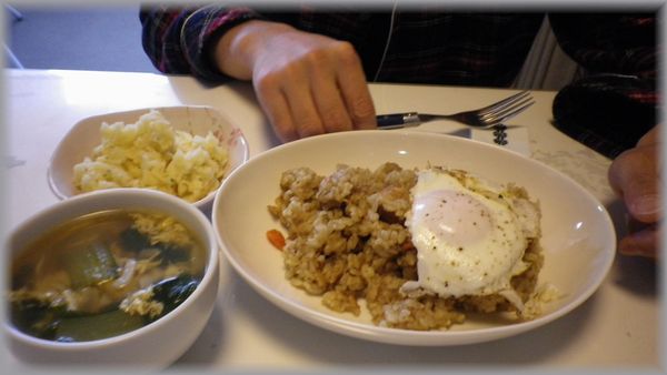 ダーリンが作ったカレーをリクに応ぇて 今朝ゎドライカレーにしてみました共同作業です卵スープは チンゲンサイをいれたょ。ポテトサラダも得意(*^ー^*)