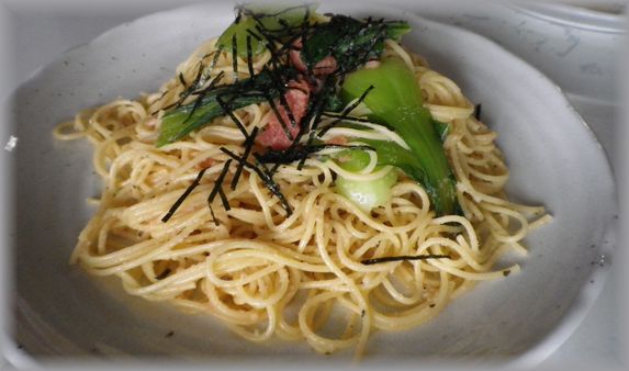 ダーリン大好きな 定番のランチパスタゎ明太子スパです。アンチョビを使って味付けしています。今日も めっちゃ美味しい~♪って喜んで食べてくれました。