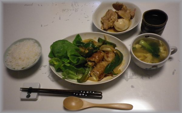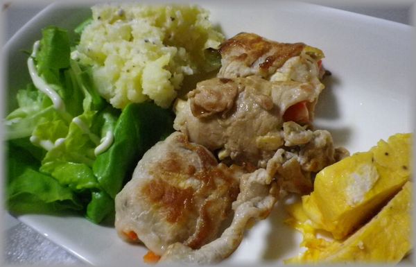 こなぃだの酢豚に味をしめとにかく薄揚げとチーズを豚で巻くのが大好きになり今回ゎ酢豚風の味付けでゎなく照り焼き風の味付けにしよぉと思い・・・中に人参やらシメジをいれて巻きました。合わせメニューゎポテサラと玉子焼き サラダ菜ですまさに思考回路が 夕飯時にあすのお弁当の具材をイメージしてる・・・そんなもんですょね。笑