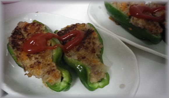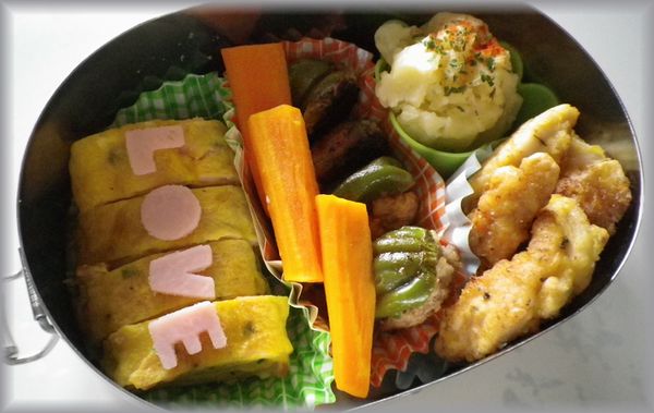 本日のメニューゎミニピーマンの肉詰め鶏胸肉の唐揚げ人参のグラッセ玉子焼き(ハム&ピーマン入り)残業用にゎいつもの米粉ドーナツ