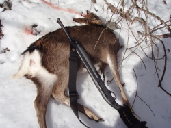 今期2頭目。13日、通常は狩猟が禁止されている特別保護区での広域有害駆除での猟果です。前回(12月)とは別の場所で、こっちは比べものにならないほどたくさんのシカがいました。イヌを使った巻き狩りですが、イヌの働きよりも獲物の絶対量の差が猟果につながったみたいです。 で、林道から枝分かれした作業道へ。沢沿いに走るのを撃つということで、その沢には私を含めて6人が入りました。このうち4人が作業道から、残りは谷底の河原で狙います。作業道にいる私と河原にいる1人がスラッグ弾、ほかはみんなライフルです。作業道からは対岸の斜面を跳ぶシカも撃てますが、対岸はライフルの人たちに任せて私は河原への撃ち下ろし。見通しバッチリ、いつでも来いです。全員がタツマに着くまで、つまりイヌを放すまでにおよそ1時間。日影の雪の中で足踏みして(寒い)待ちます。 イヌをかけてさらに1時間、中流にいる私の耳に上流と下流から次々に銃声が届きます。「なーんだ、こっちにゃこねーじゃん」とスネかけてさらに30分余り、作業道にも日が当たり出したころ、河原じゃなくて対岸をシカの群れがしかも、尾根から下りて来ます。スラッグの有効射程距離は100メートル、対岸まではどうみても200メートル以上あります。おまけにわたしの腕じゃ―。「えーい、当たらなくても上か下で止めてくれるさ」ってんで撃った2発目が命中。なーんと、こんな遠いの獲ったの初めてです。デジカメジンクスも見事に崩れ、一安心。とーぜん、ライフルの人たちも獲りました。