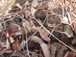枯れ葉に混じって見えにくいですが、(写真)はイノシシの糞です。辺りは小便の臭いも立ち込めていて、つい先ほどまでいたらしい気配。どうやら私たちが登ってきたのを察知して、早々に場所を移動したようでした。尾根道から少し外れた斜面の中でしたが、保護区で普段はハンターが来ないところなので、こんなところで寝たりもするのかと思いました。 で、足跡とともに獣の糞は猟のいい手がかりになります。新しければ近くにいる可能性があるし、古くてもたくさん落ちている場所は、そこがよく群れる場所であることを示しています。以前は、共猟でメンバーが集まらない時はカモやキジを撃ちに行ってましたが、最近、足跡や糞を頼りに単独忍び猟の真似事をしています。これで獲れたらすごいんですが、獲れなくても家の裏山に出てくるシカの行動パターンをあれこれ想像するのは楽しいもんです。いつか獲ってやるぞってね。 登山をしていても、登山道で鳥や獣のいろんな糞を見ることがあります。いつだったが北アルプスを歩いている時に、先頭の人がサルの糞を踏んでしましました(高山では登山道脇に用足しに入って、人糞を踏み黄金の○足になってしまうことも。水がないので泣くしかありません)。真新しい糞で、しばらく先にサルの群れがいて私たちと睨み合いになり、ちょっと怖い思いをしたものです。